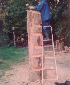 鈴木さんはここで製材所から入手した丸太を素材に木彫を大小合わせて10点ほどと水墨画をたくさん制作し、大きな作品は別荘の庭にそのまま残しました。(写真右は、トーテムポール状の「誕生3連」を制作中の鈴木さん)